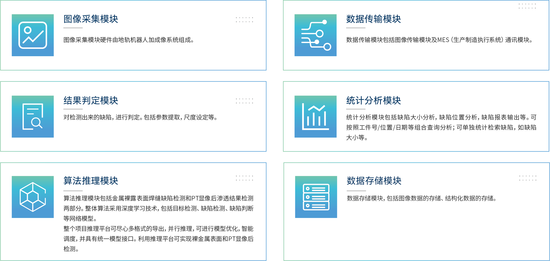 通过智眸工业机器视觉的产品对换热器管板密封焊缝进行质量检测,方案包括硬件部分和软件部分,硬件主要有机器人、地轨、2D相机、3D相机、激光测距仪、工控机等,软件主要是“离娄”机器视觉智能创新应用平台、控制软件等,项目采用智能检测系统,通过采集的密封焊缝的高清图像,利用计算机图像处理与智能技术主动识别焊缝表面开口缺陷,快速完成缺陷识别、标记、记录和分析。可降低人员工作强度,提高产品质量判定效率、精准度和稳定性,增强结果可追溯性,顺应绿色环保的发展趋势。